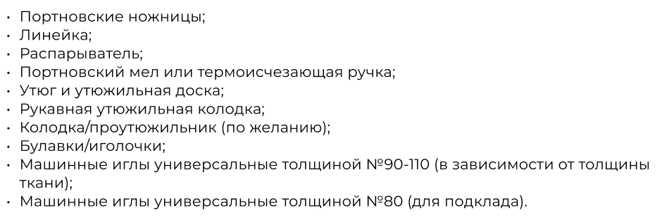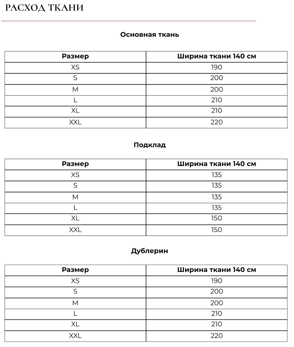 Рекомендации по ткани: Основная ткань: костюмная шерсть, твид, габардин, костюмная вискоза, смесовые ткани с содержанием шерсти или полиэстера. Подкладка: вискозный сатин, купра, шёлковый твил или тонкий хлопок.