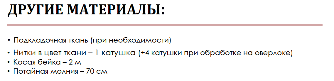ОБОРУДОВАНИЕ И ПРИСПОСОБЛЕНИЯ: • Машинные иглы универсальные толщиной №80 – №90 (в зависимости от толщины ткани) – для основной ткани • Машинные иглы универсальные толщиной №80 – для подкладочной ткани • Односторонняя лапка (для пришивания потайной молнии) • Портновские ножницы • Линейка • Распарыватель • Портновский мел или термоисчезающая ручка • Утюг и утюжильная доска • Рукавная утюжильная колодка • Колодка / проутюжильник (по желанию) • Булавки / иголочки